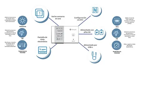 • sensores integrados: temperatura, humedad, CO₂, TVOC, luz, presión barométrica y movimiento (PIR).
